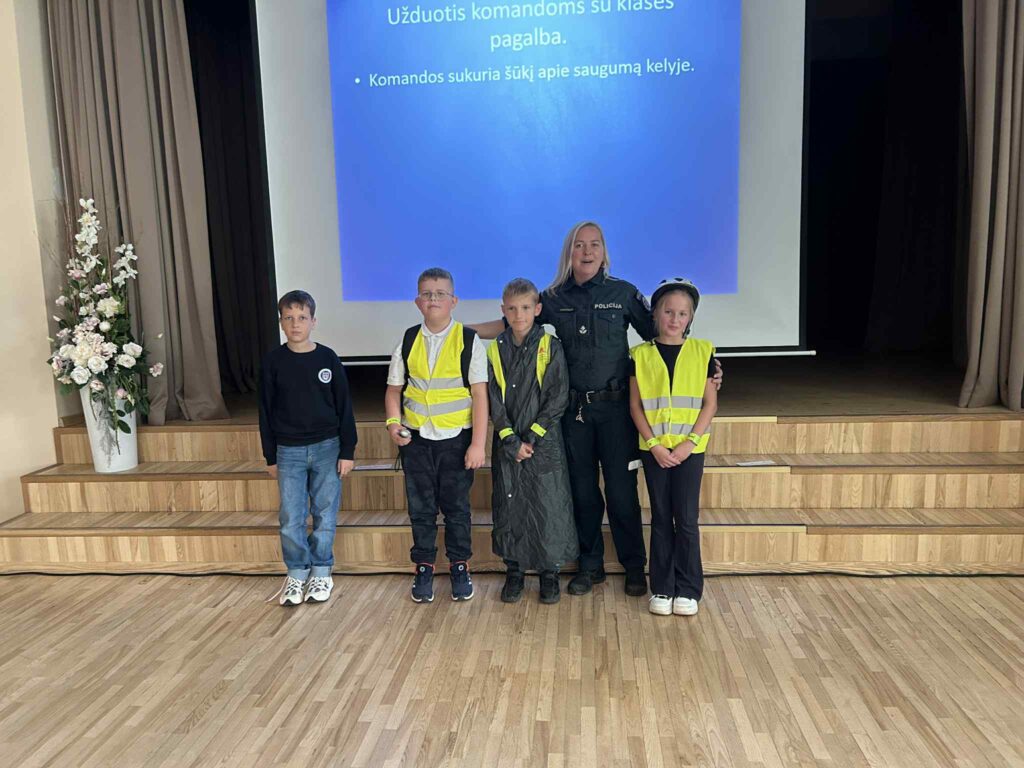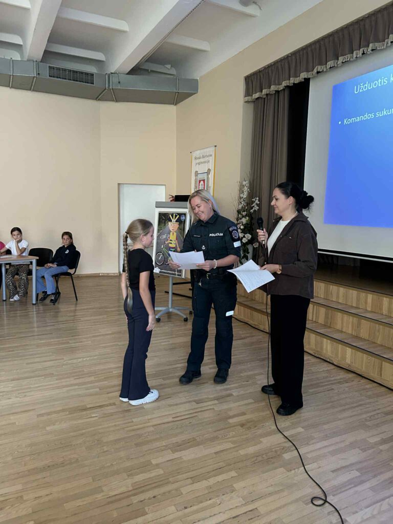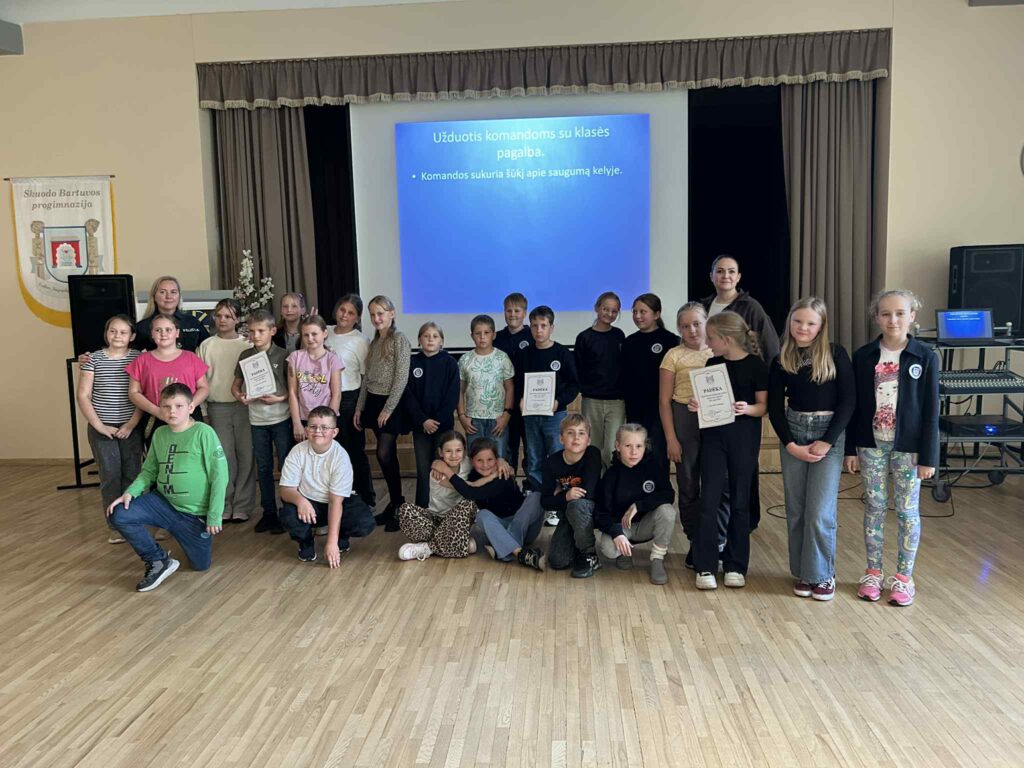 Skuodo Bartuvos progimnazijoje vyko saugaus eismo viktorina „Esu saugus kelyje“, kurią vedė policijos pareigūnė Lina Tiškuvienė ir socialinė pedagogė Gitana. Mokiniai dalyvavo įvairiose veiklose: atsakinėjo į klausimus apie saugumą gatvėje ir kelyje, saugaus eismo taisykles, atliko įvairias praktines užduotis. Jie vilkėjo dviratininko aprangą, mokėsi, kaip saugiai keliauti tamsiu paros metu – pėsčiomis ir su šviesą atspindinčiomis liemenėmis, dėliojo dėliones.