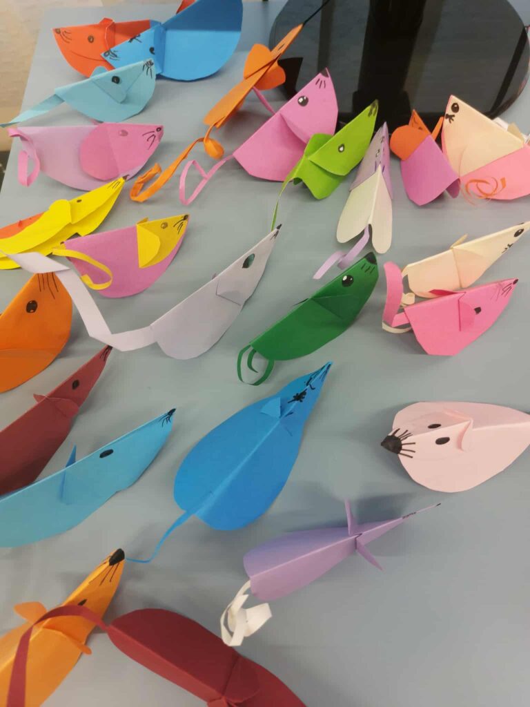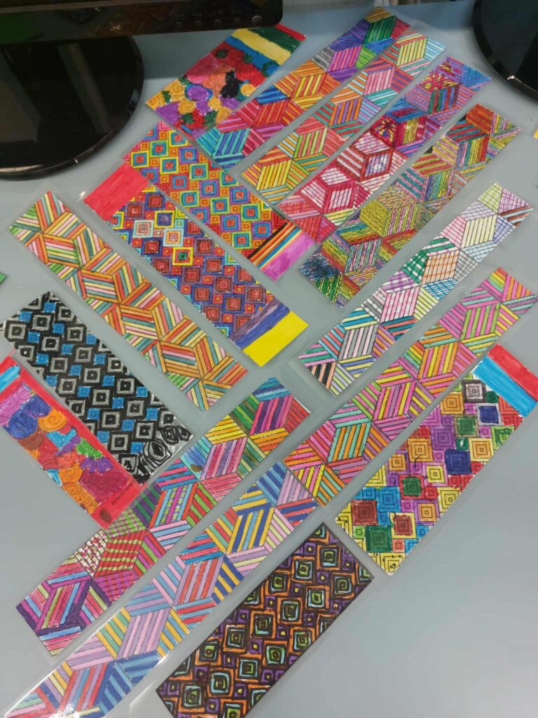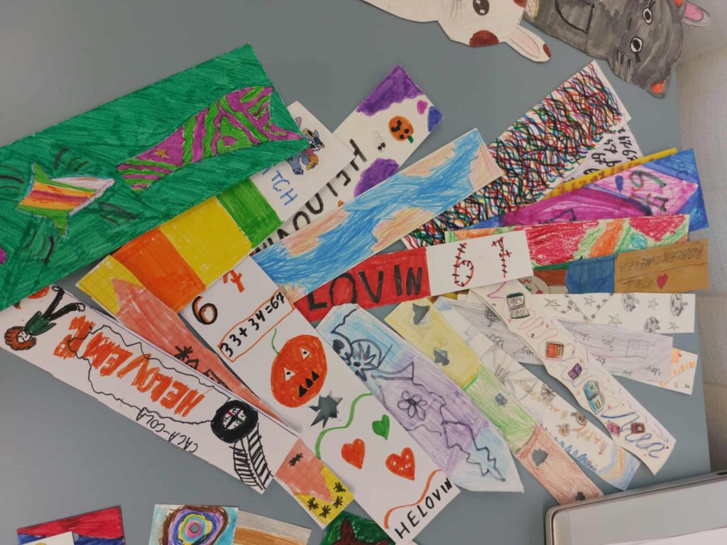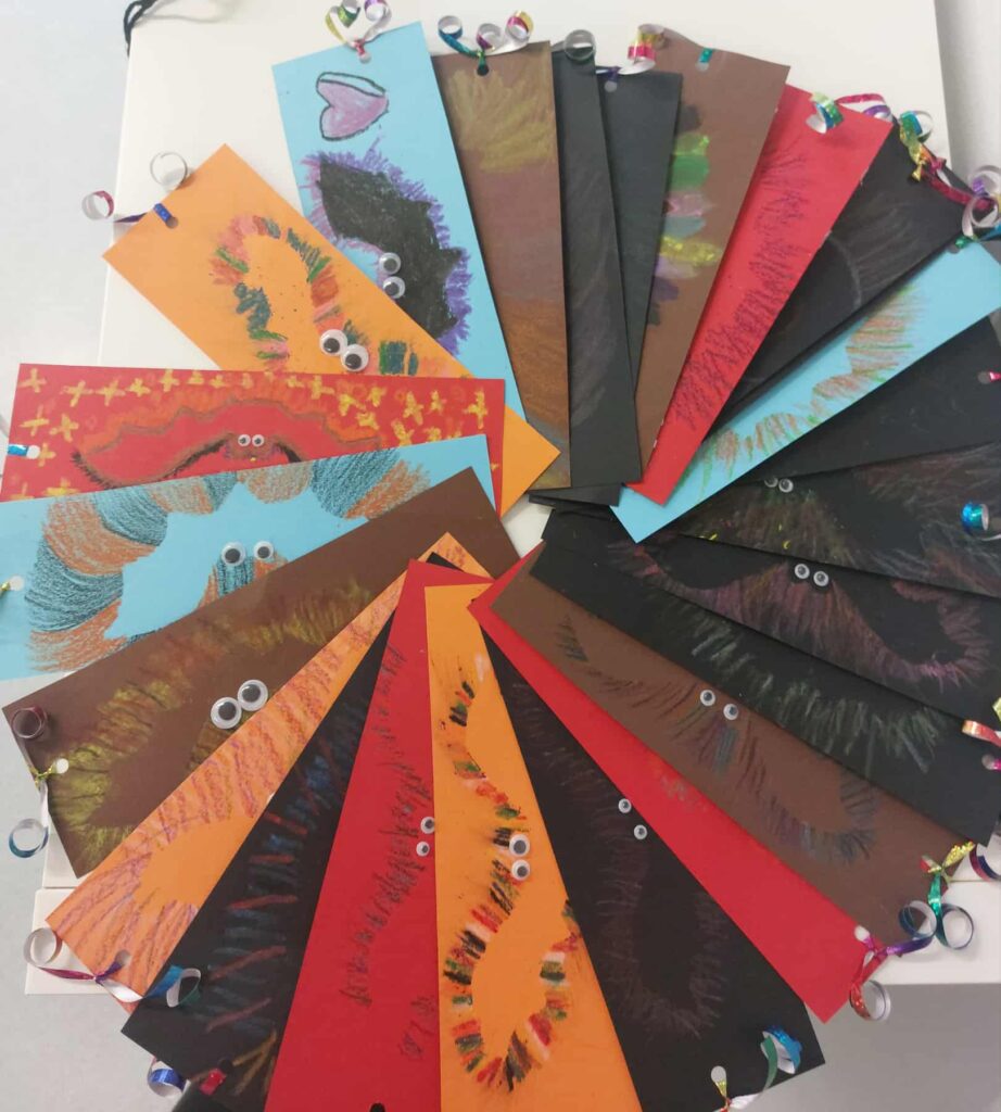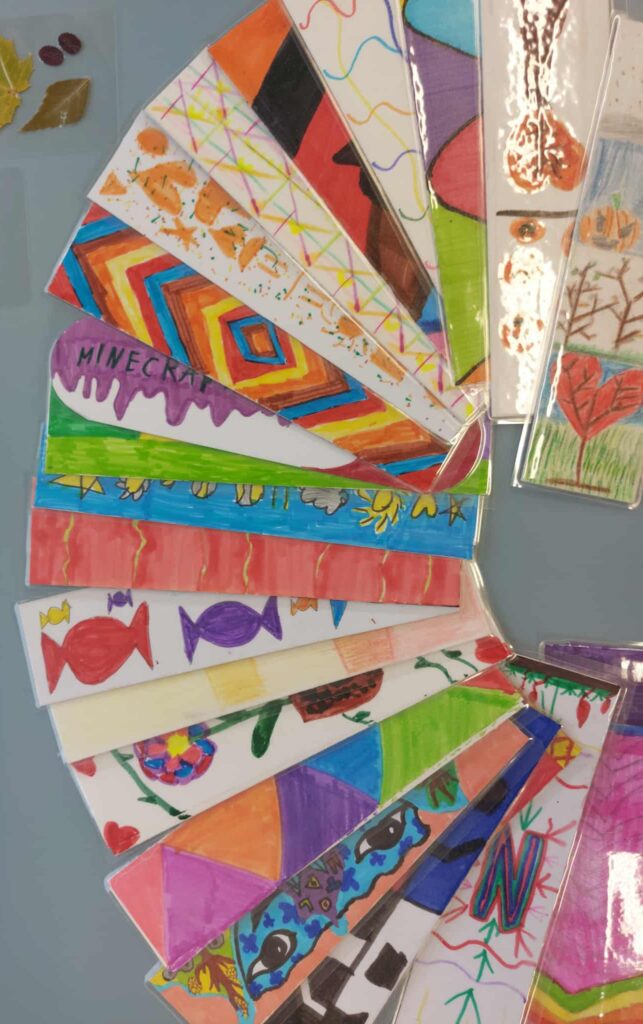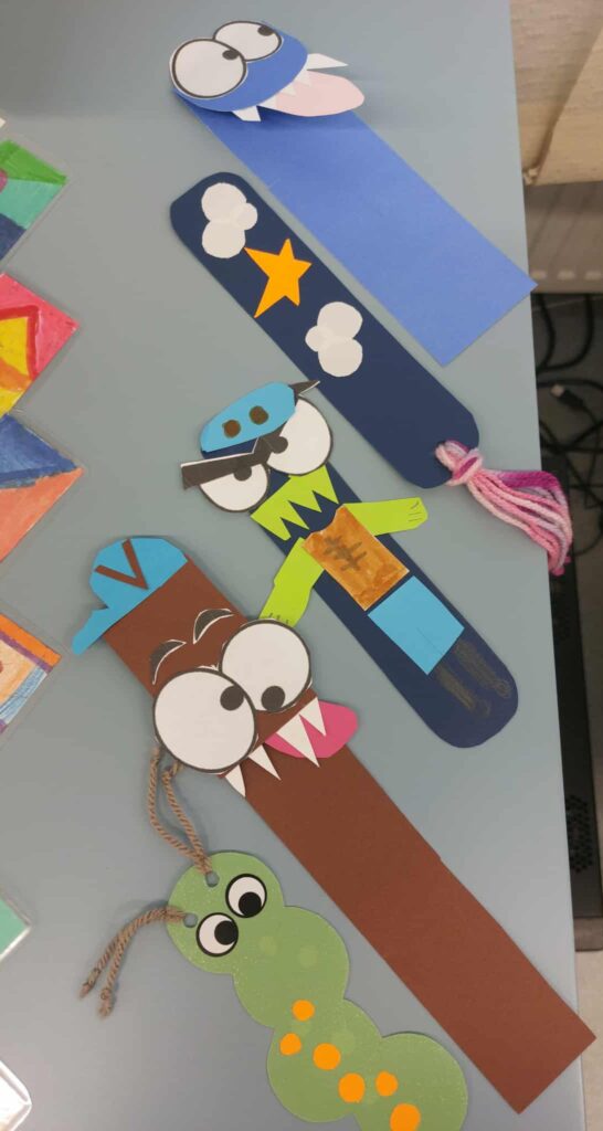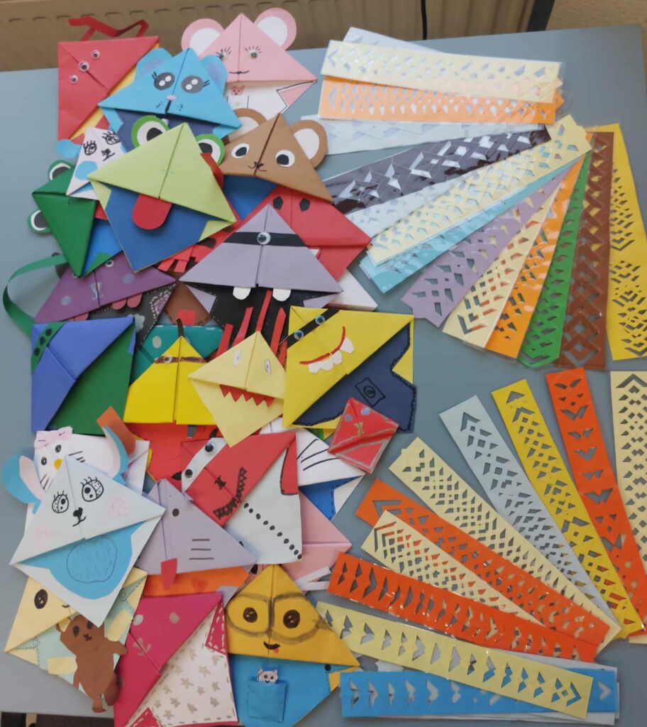 Trumpam skirtukai buvo išeksponuoti progimnazijos bibliotekoje.Šią gausią parodą apžiūrėti buvo pakviestos pradinių klasių mokytojos. Prie arbatos puodelio mokytojos pasidžiaugė vaikų darbais, aptarė spalio mėnesį bibliotekoje vykusias veiklas, skaitė dirbtinio intelekto sukurtas citatas „Knygų skaitymas – tai…“. O vaikų pagamintus skirtukus sumaišė ir jiems dovanojo dvi raganaitės – bibliotekos darbuotojos Bronislava Domarkienė ir Sigita Dabrienė. Nuo pat ankstyvo spalio 31 d. ryto jos beldėsi į pradinių klasių duris, stebino vaikus savo išvaizda, kitoniška kalba, dovanojo skirtukus, kvietė užeiti į biblioteką ir stebuklingos šluotos pagalba išsiburti knygą, bei laimėti brangšmutkę arba saldamaką.