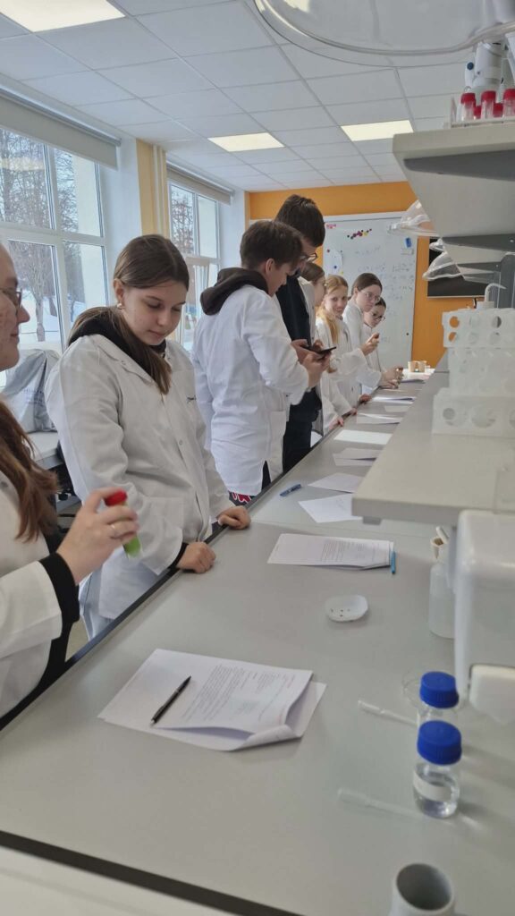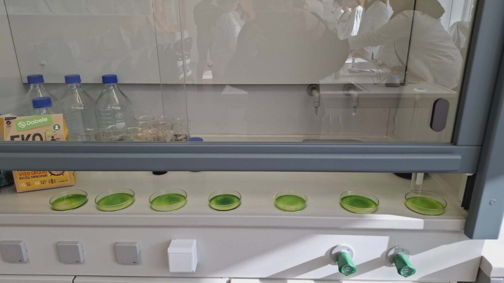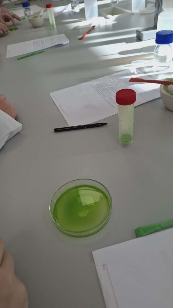 Ten jie atliko laboratorinį darbą „Kodėl augalai žali?“. Mokiniai sužinojo, kad lapų žalią spalvą lemia chlorofilas. Praktinės veiklos metu jie pamatė, jog susmulkinus lapus ir įpylus acetono, tirpalas nusidažo žalia spalva – tai įrodė, kad pigmentas ištirpsta tirpiklyje.