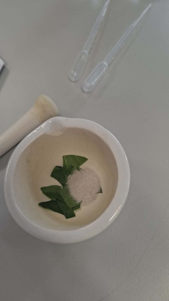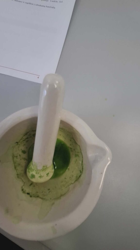 Atliekant darbą reikėjo kruopščiai smulkinti lapus, kad išsiskirtų kuo daugiau chlorofilo. Mokiniai suprato, kaip svarbu tiksliai laikytis darbo eigos ir saugumo taisyklių, nes naudojamos cheminės medžiagos yra degios ir kenksmingos.
