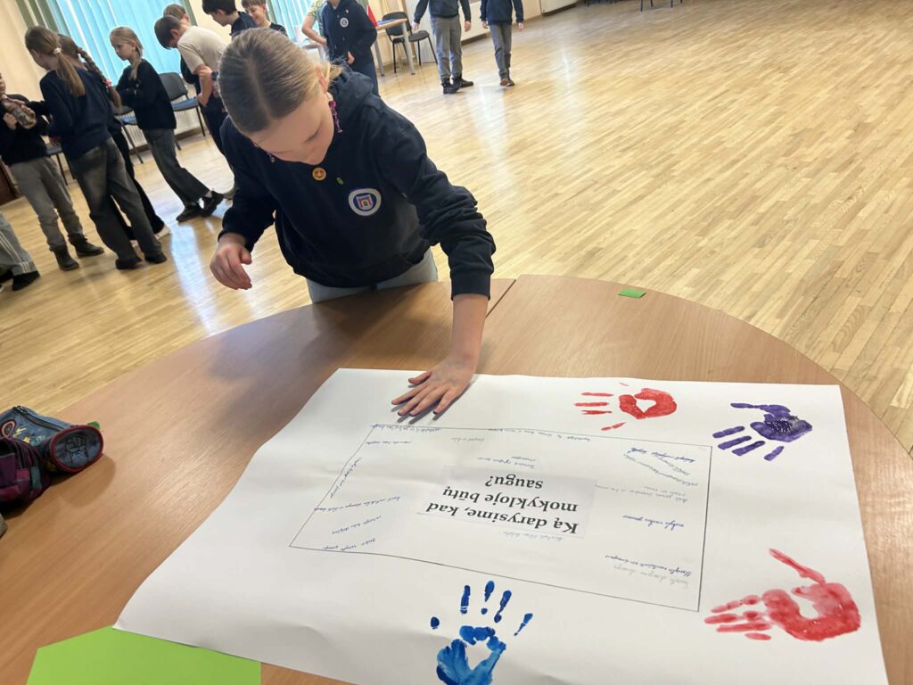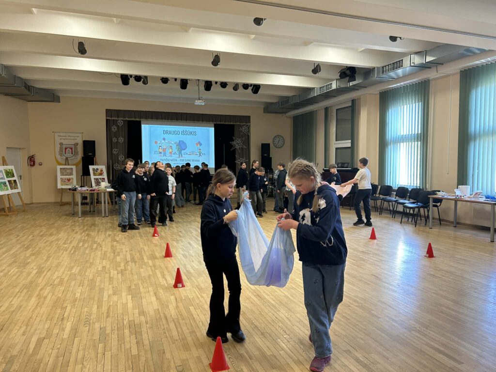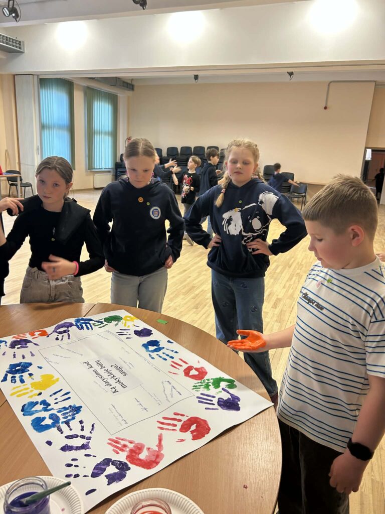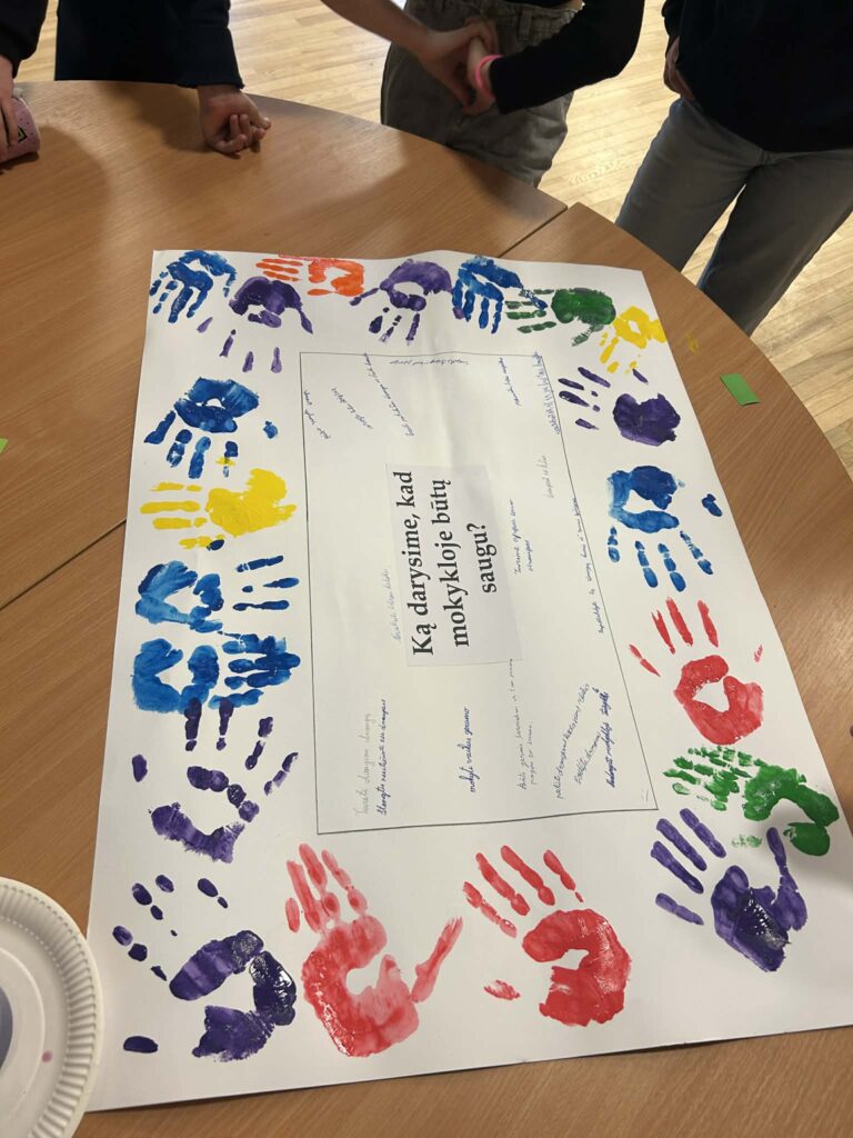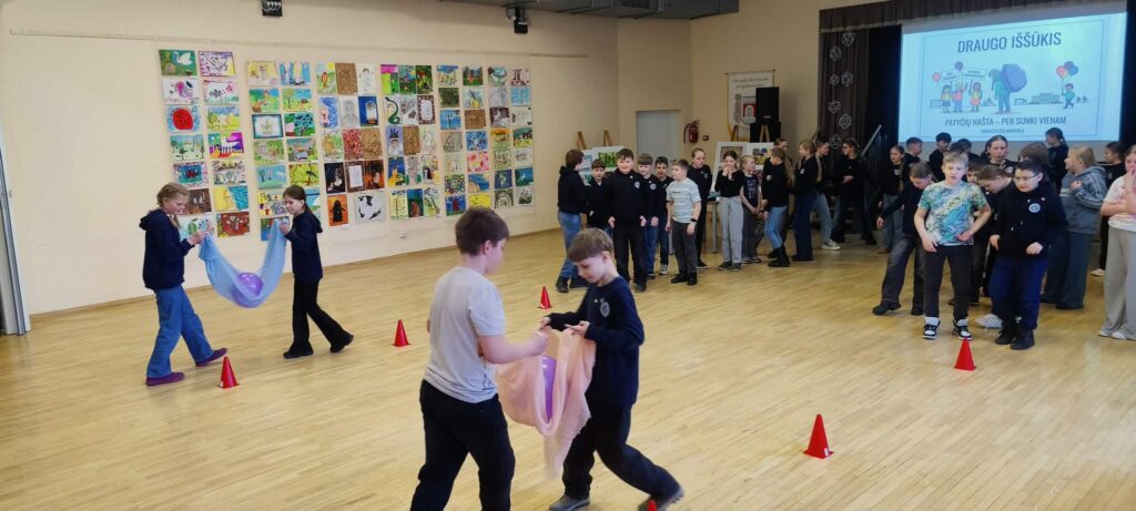 Sugrįžę į aktų salę mokiniai atliko smagų komandinį „Draugų iššūkį“, kuriame turėjo bendradarbiaudami pernešti balioną. Paskutinėje užduotyje komandos kūrė plakatus su idėjomis, kaip mokykloje sukurti saugią ir draugišką aplinką, o savo pažadus patvirtino rankų antspaudais.