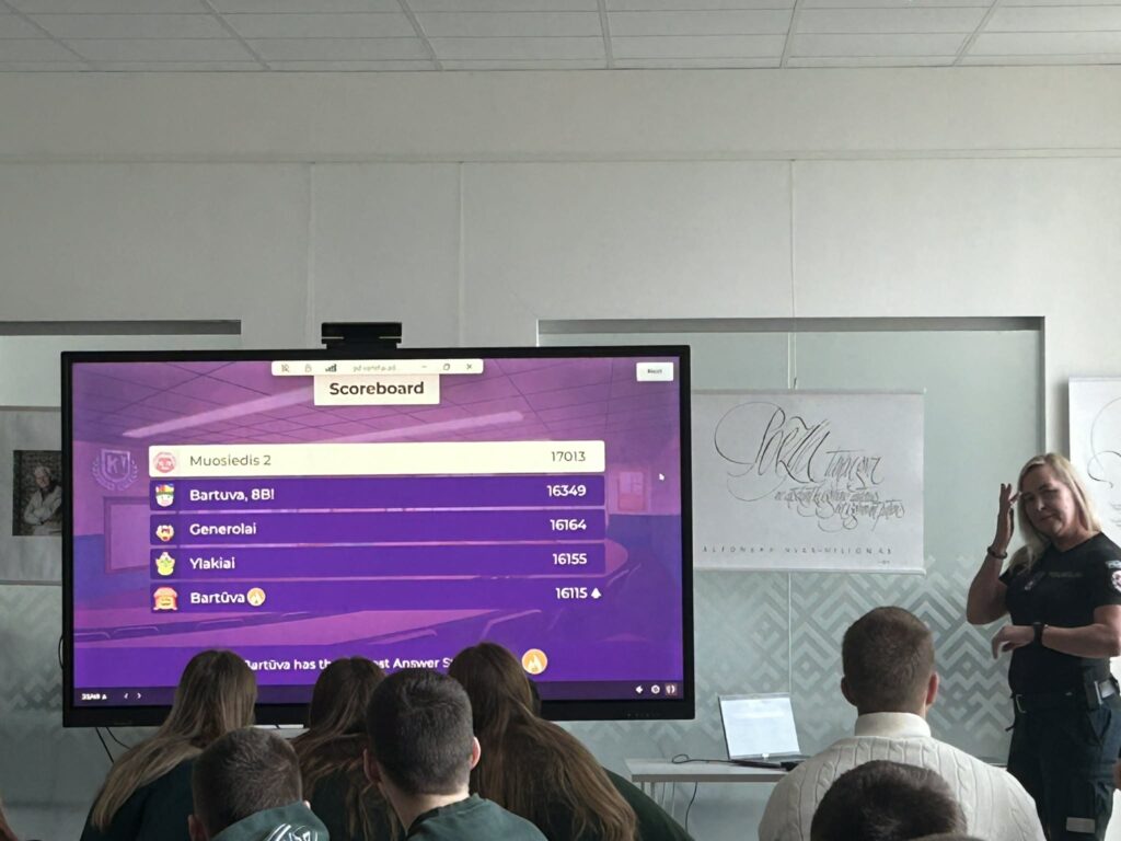 Šiandien dvi mūsų progimnazijos aštuntokų komandos dalyvavo policijos organizuotame konkurse „Aš ir policija“. Žinių ir reakcijos reikalaujančiame Kahoot žaidime varžėsi net devynios komandos iš skirtingų mokyklų.