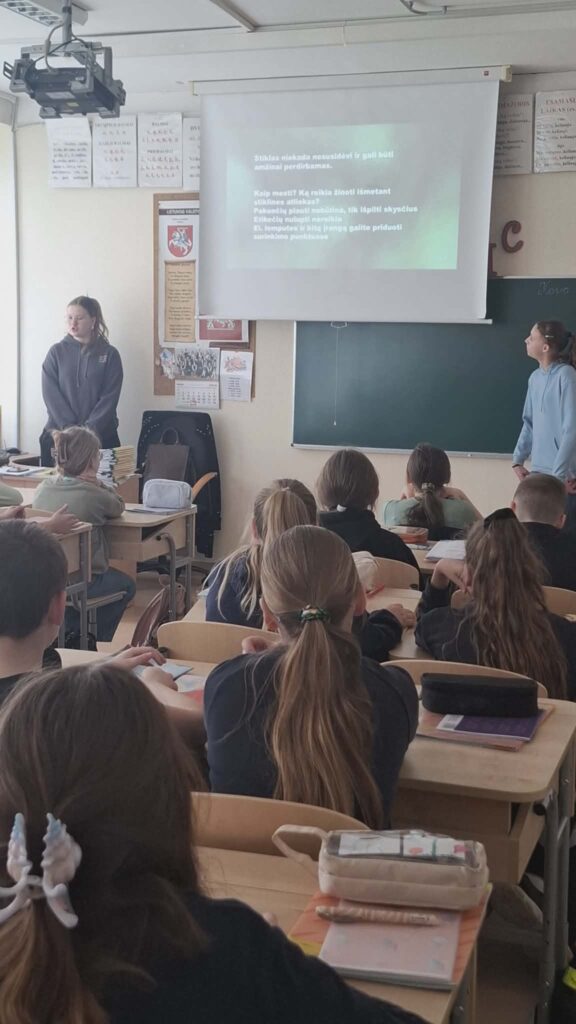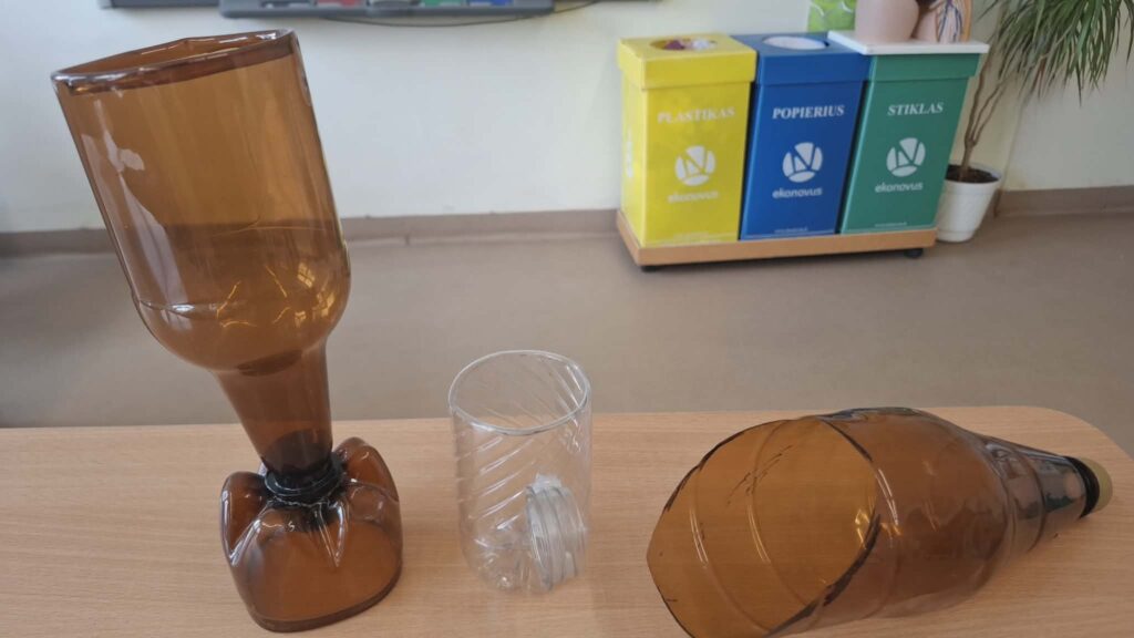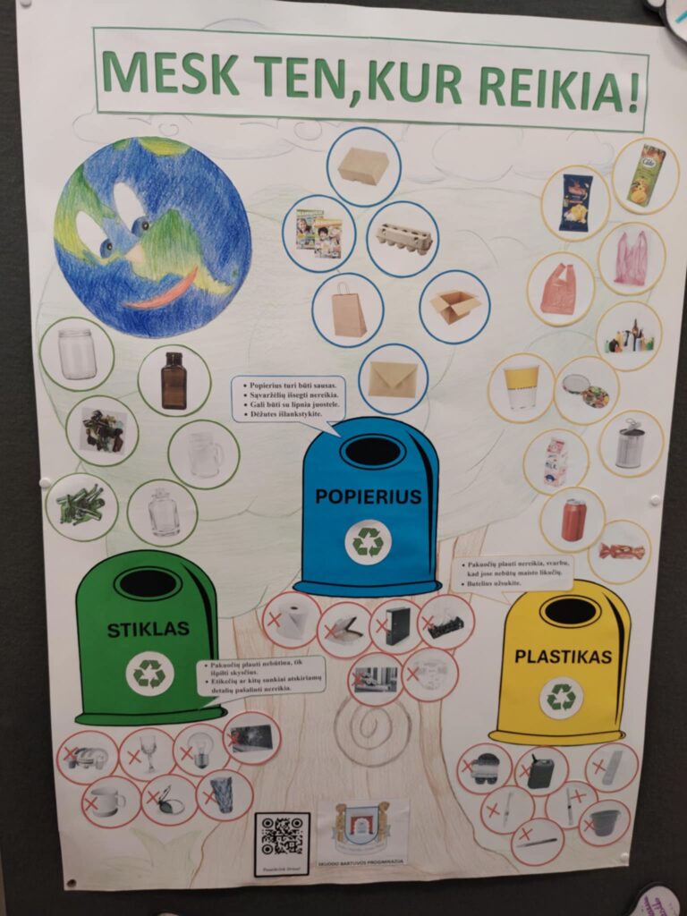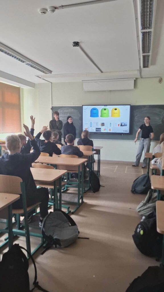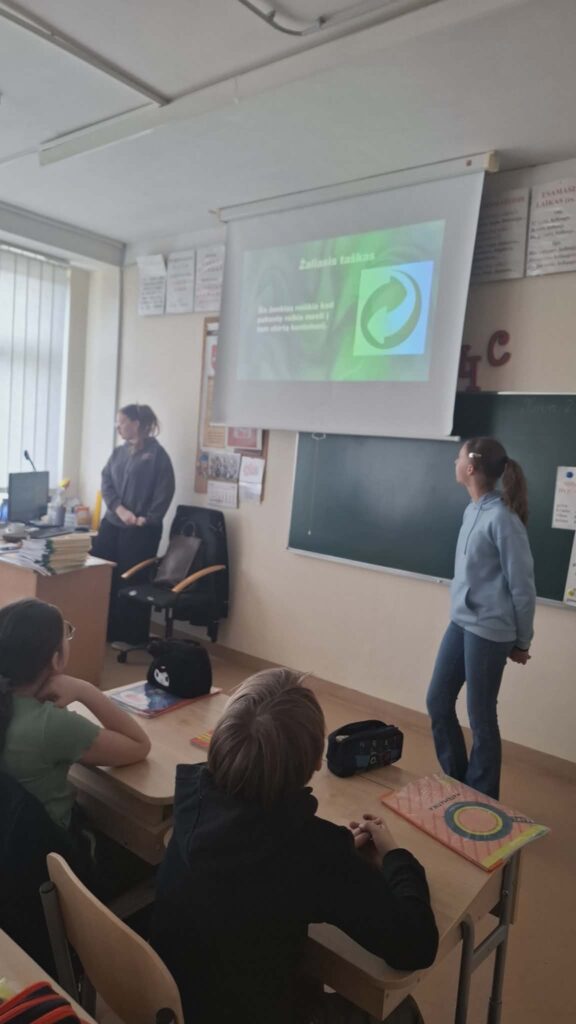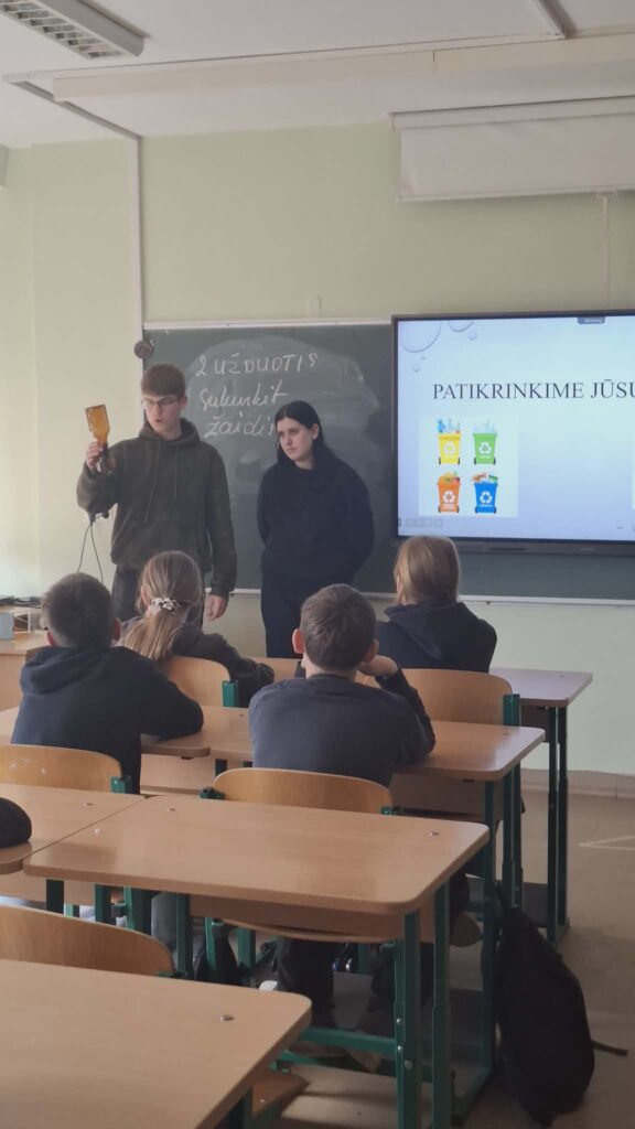 Gamtamokslinio ugdymo būrelio nariai – 7c klasės mokiniai Ugnė Jonušaitė, Danielius Preibys, Emilija Strakšytė ir 8c klasės mokiniai Austėja Butkutė, Greta Perminaitė, Povilas Liuteris parengė pranešimus ir 3 – 5 klasių mokiniams pasakojo, kaip atsakingai rūšiuoti atliekas bei suteikti daiktams antrą gyvenimą.