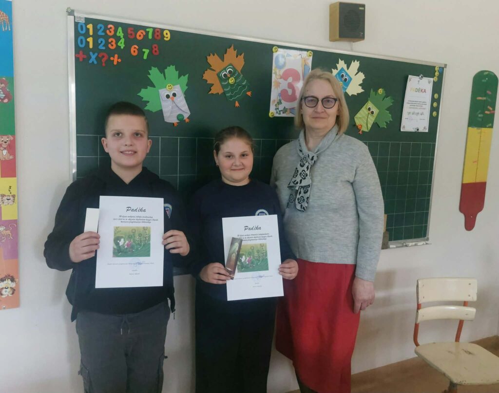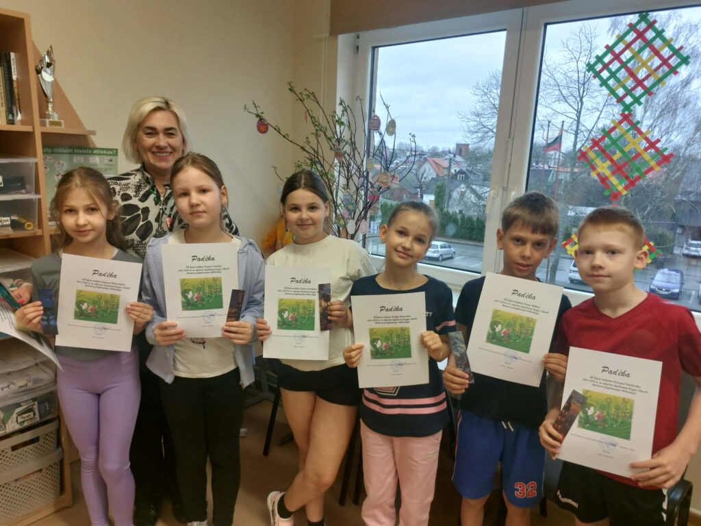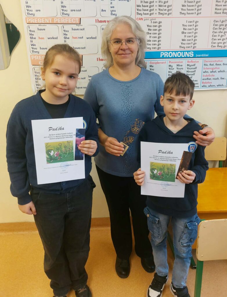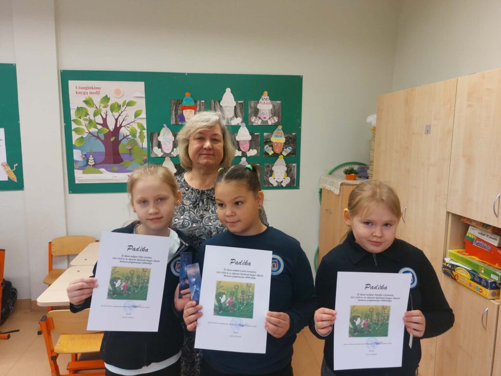 Padėkos įteiktos 2a klasės mokiniams Kamilei Jonkutei, Danieliui Lekstučiui (klasės vadovė Edita Pocienė), 2c klasės mokinėms Viltei Griciūtei, Amelijai Litvinaitei, Gustei Stasiulytei (klasės vadovė Rima Narkuvienį), 2d klasės mokinei Lukai Nemeikšytei (klasės vadovė Asta Jekučinskienė).