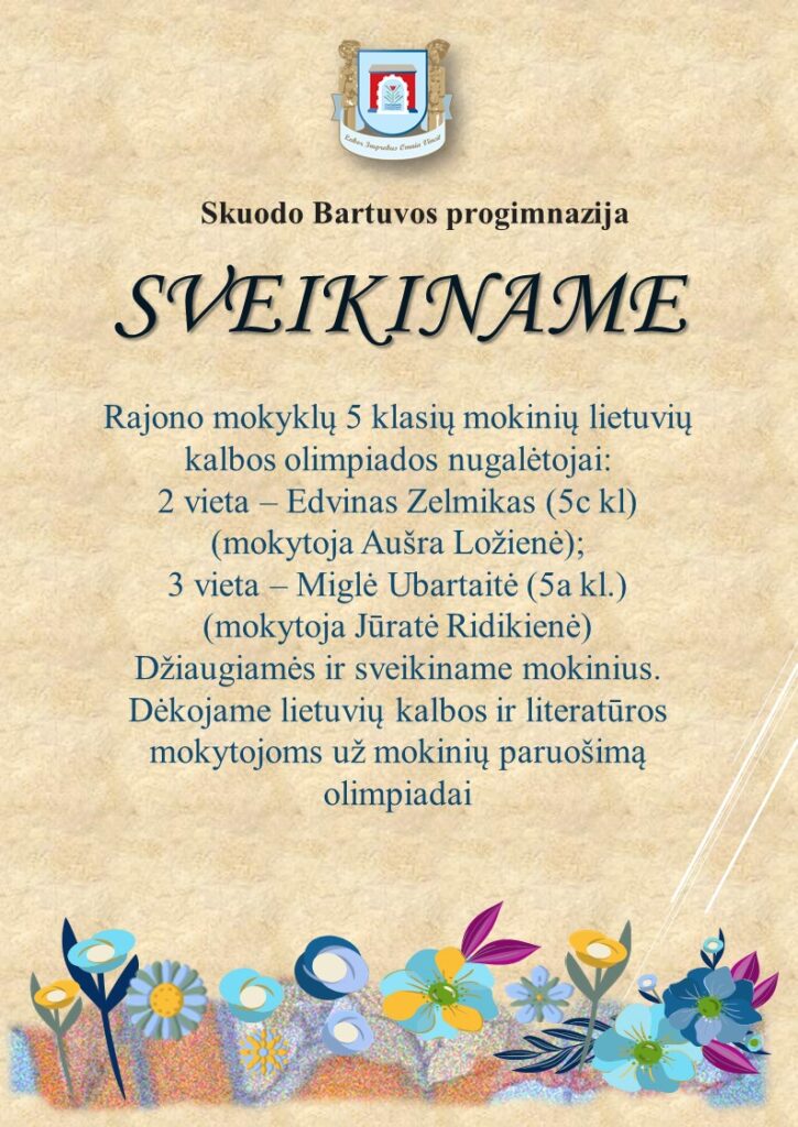 Balandžio 17 dieną Kretingalėje vyko Klaipėdos apskrities mokyklinio amžiaus vaikų ir jaunimo meninio skaitymo konkursas „Saliamonas”. Džiugu, kad tarp 78 skaitovų iš 8 Klaipėdos apskrities rajonų ir miestų Skuodo rajonui atstovavo net keturi mūsų progimnazijos mokiniai: Orestas Bumbulis iš 2d klasės, Pranciškus Nekrošius (5c klasė), Daniela Zabitytė (7a klasė), Aistė Laukineitytė (7b klasė). Orestą konkursui parengė mokytoja Asta Jekučinskienė, o tris vyresniuosius – Aušra Ložienė. Nuoširdžiai dėkojame mokiniams už įtaigų meninį žodį!