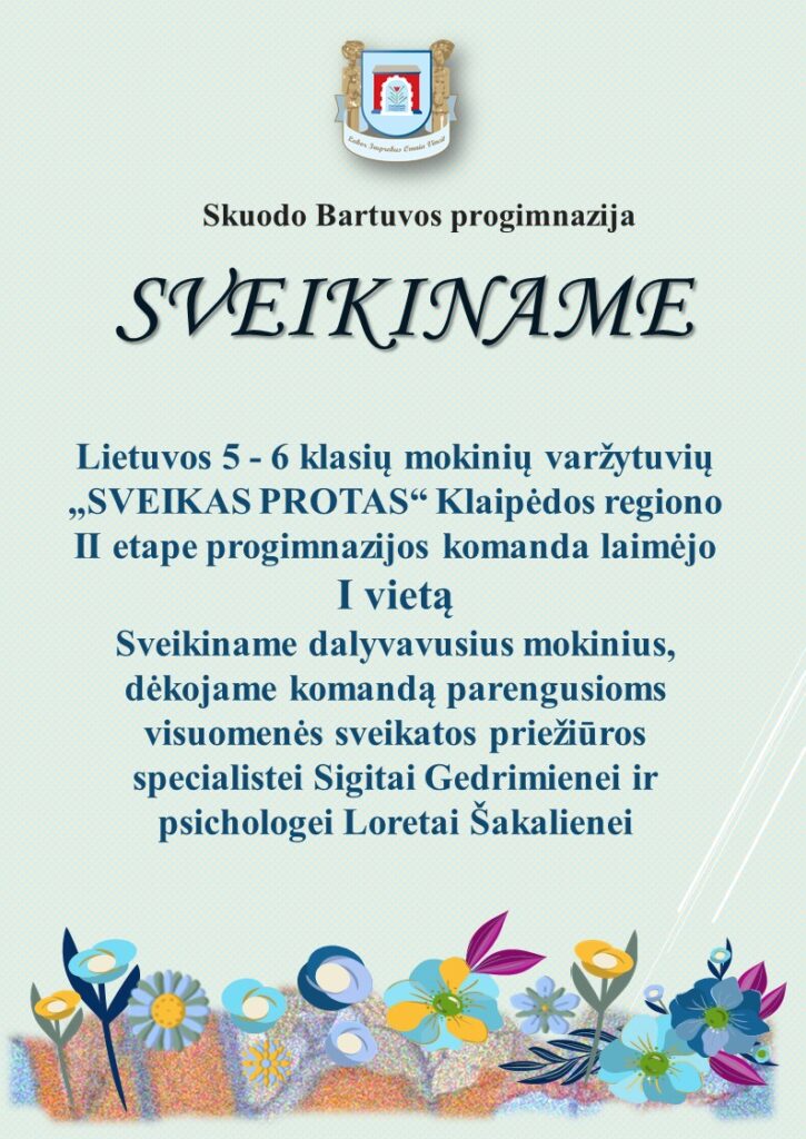 Lietuvos 5- 6 klasių mokinių varžytuvių „SVEIKAS PROTAS““ Klaipėdos regiono II etape laimėta I vieta. Gruodžio 10 d. Klaipėdos Vyturio progimnazijoje vyko LINEŠA organizuojamų varžytuvių „Sveikas protas“ regiono etapas. Varžytuvėse dalyvavo 7 – os komandos iš Klaipėdos miesto ir regiono. Mūsų progimnazijai, laimėję atrankinį turą atstovavo 6a klasės mokinių komanda „6a sąjunga“. Bartuvos progimnazijai atstovavo šie mokiniai: Gabrielius Sendrauskas, Guoda Galdikaitė, Paulina Gervinskaitė, Elzė Vasiliauskaitė, Gabrielė Tiškutė.