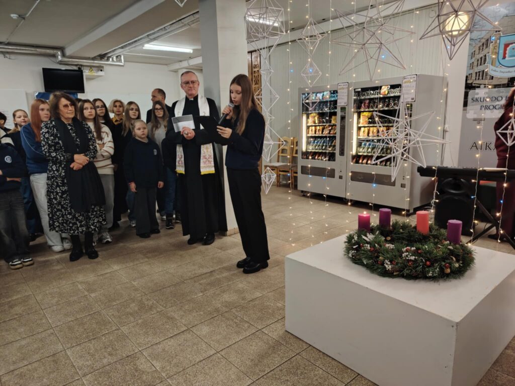 Trečiadienio rytą mokyklos fojė pasitikome kitaip – uždegėme pirmąją advento vainiko žvakę, simbolizuojančią viltį ir naujos šviesos pradžią. Mus aplankė Skuodo parapijos kunigas Sigitas, kuris pasidalijo prasmingais palinkėjimais ir kvietė adventą sutikti su ramybe širdyje. Rytmetį papuošė mokytojos Jurgitos giedamos giesmės ir advento vainiko palaiminimas.