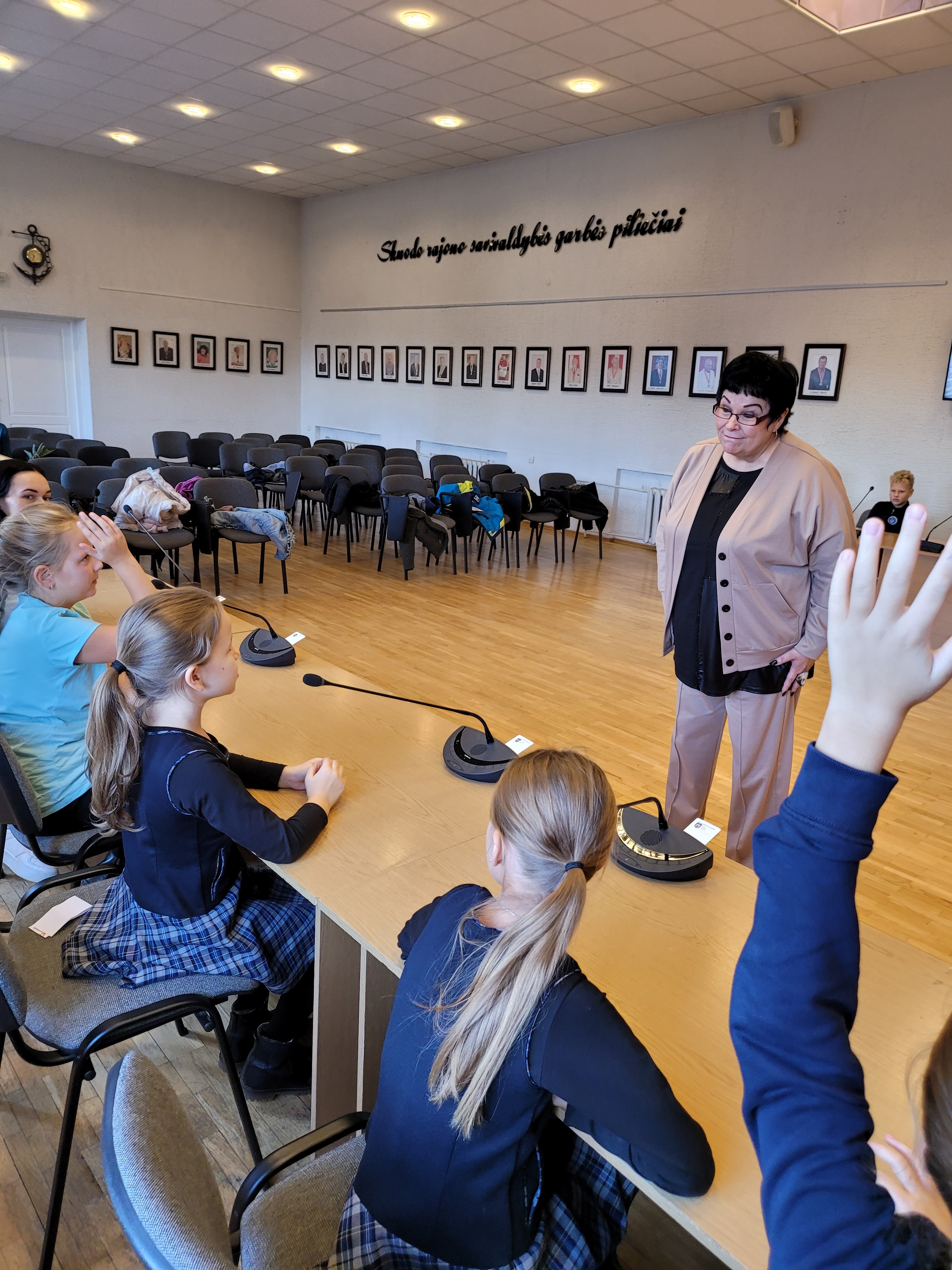 Savivaldybės tarybos posėdį padėjo vesti savivaldybės vicemerė Audronė Pitrėnienė. Pirmininkavo „merė“, 3 a klasės seniūnė Paulina. Posėdyje svarstėme aktualius mums klausimus, kuriuos patys iš anksto buvome sugalvoję: 1. Dėl gyvūnų prieglaudos įkūrimo Skuodo rajone. 2. Dėl bendro vaikų ir tėvų užimtumo centro steigimo. 3. Dėl atliekų rūšiavimo centro įsteigimo Skuodo rajone. 4. Dėl liftų bei pakėlėjų pritaikymo neįgaliųjų poreikiams. Sėdėjome Tarybos narių vietose ir vyko tikras balsavimas spaudant monitorių mygtukus, išsakėme nuomones ir argumentus, priėmėme sprendimus.